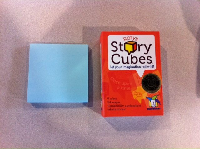 Rory, who ever and where ever you may be, the invention of the Story Cubes is great! In this small box, (picture taken next to a stack of post-it notes for size reference) you get 9 cubes. Each cube face had a different image which means that there are over 10 million combinations that can be created with the roll of the cubes! There are a couple of different suggestions for how to play in the box, but the basic premise is, you roll the cubes, and based on what images you get, you create a story.